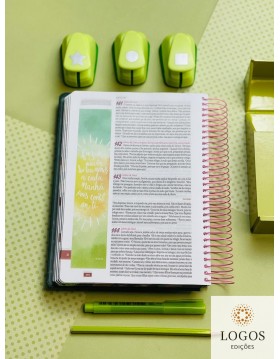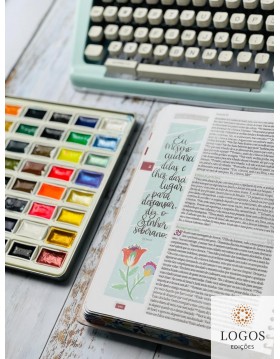 * Na parte final da Bíblia tem um caderno de registo com plano de leitura, espaço para anotações, desenhos para colorir, tutorial para fazer desenhos e lettering.