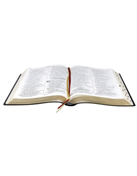 Esta bíblia de luxo tem as palavras de Jesus a vermelho e índice digital.