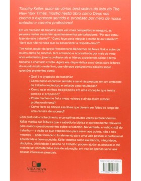 Tim Keller tem ensinado e aconselhado, ao longo de mais de vinte anos estudantes, jovens profissionais e líderes experientes sobre o tema do trabalho e a chamada do cristão. Agora, disponibiliza as suas ideias para os leitores de todo o mundo, oferecendo perspectivas bíblicas sobre questões prementes como:
